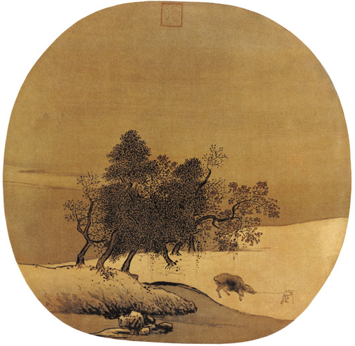 此图不知原载何册,签题夏圭作。但按其风格,实际是夏圭之前的作品,因此只好用无名氏传载下来。画面晴空草坡,水石清瑟,大树数株,傍溪而立,树叶已转枯黄,纯然是秋天的景色。水牛为牧童所牵而缓行,表现了农村的生活场景。