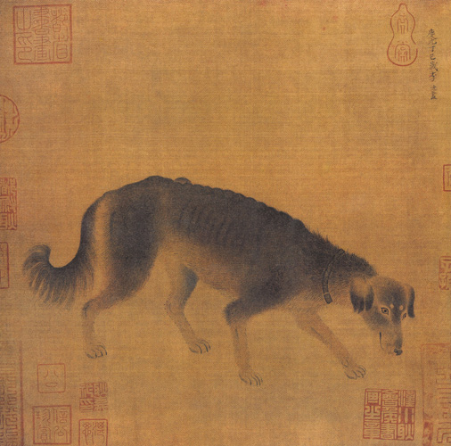 此图原载《历代名笔集胜册》第一册(见《虚斋名画录》)。画上题云:庆元丁巳岁李迪画。在描状动物方面,李迪的成就是很高的。犬与鸡雏均是日常习见之物,丝毫苟简不得,而他描绘得非常逼真而活泼可爱。前画中的二鸡雏,清高宗曾临写之,并曾刻在象牙上,可见是深受人喜欢的一幅画,画幅虽小,意趣却很悠扬。