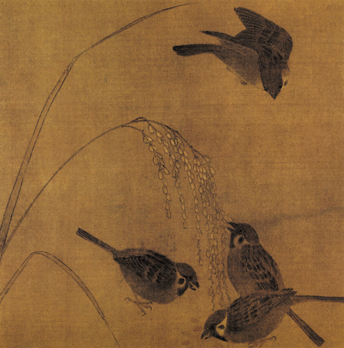 此图在一定程度上体现了“皇家富贵”的风格。画面构图简单,画法严谨工丽,以点概面,一颗丰硕的稻穗象征了丰收之景况。四只情态各异、活泼欢乐的麻雀占据了画面的主要部分:一只高飞俯视,一只仰头啄谷,一只口衔谷粒,一只正专注拣地上的谷子,神态很是可爱。