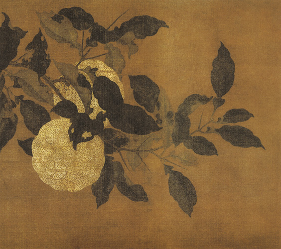 画上无款。画法双钩设色,敷色晕染,工力俱深,叶色之嫩老,香实之垂金,传神毕肖。果叶疏密有致,正侧偃斜,卷曲掩映,深有空间感。