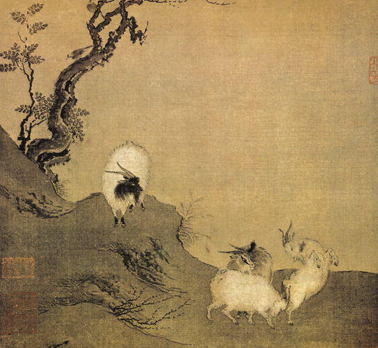 陈居中,生卒不详,南宋画家,曾任画院待诏,专工人物、番马,描绘物态准确自然,画法精细,形神兼备。此图以左实右虚的一角景式构图,描绘四只毛色各异的山羊。画面构图简洁,精练的笔墨,淡雅的设色和准确生动的形象,充分而传神地表现了山羊顽皮、好斗的天性。坡上枯木荆棘,木叶凋零,野草枯黄,画面上一派清秋幽旷的氛围,富于生活情趣。
