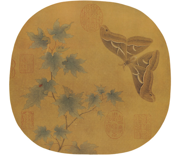 此图原载《纨扇画册》(见《石渠宝笈三编》)。无作者姓氏。构图至精,色彩尤为鲜丽,绿色的枫叶上,着一红色的甲虫,顿时丰富了整个画面。