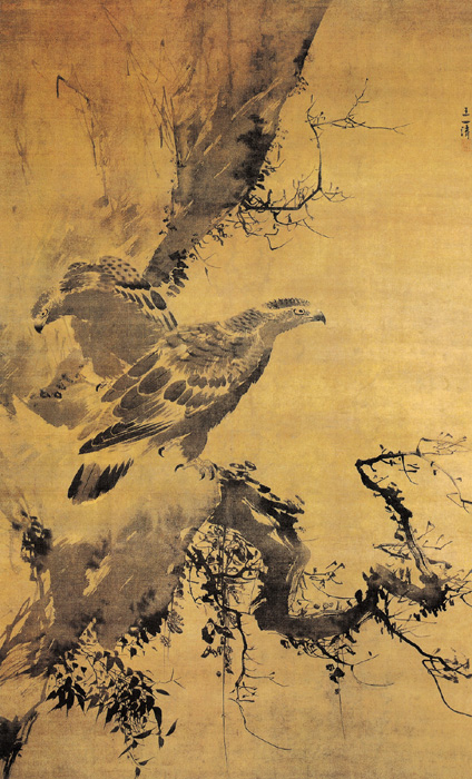 王乾(15世纪前后),字一清,初号藏春,后更号天峰,浙江临海人。他擅长画花鸟,多以写意法作寒塘野禽,轻墨淡彩,独具风格。此图描绘的是寒石之上,两只苍鹰,傲然屹立在朔风峭厉的漫天大雪之中。在用笔上,作者运用草书的笔法入画,扫出双鹰身后的陡峭的山壁,脚下突兀的岩石,由此加重了画面的力量感。作品在笔墨敷色上,墨韵色润,富于层次、力度和节奏感。整个画面,以简笔粗放为主,构图饱满而有法度,气势雄浑不凡。