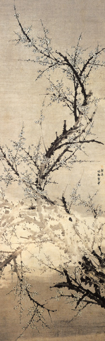 刘世儒,生卒不详,主要活动于明代正德、嘉靖(1506—1566)间。字继相,号雪湖,山阴(今浙江绍兴)人。善画梅,宗法王冕,学之不倦,终成名手。柔密疏简,俱臻其妙。尤工雪梅,冰肌玉骨,清劲俊拔,令人绝倒。图中描绘一株梅树,老干劲峭,断缺处以意笔为之犹如龙爪腾空。一带薄雾淡如轻纱,横亘于画幅中部,烟笼玉树,暗香浮动。