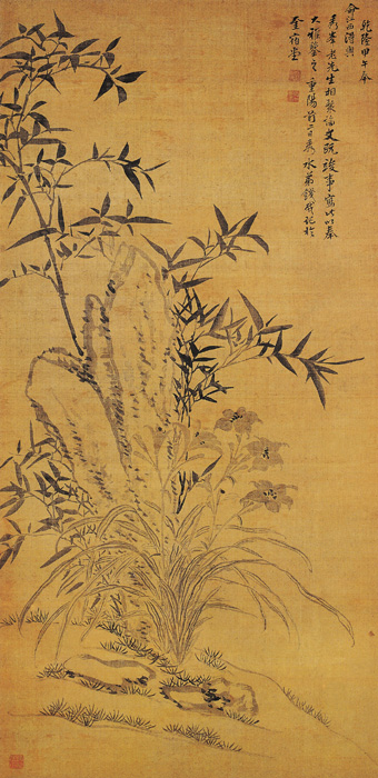 画上自题:“乾隆甲午,奉命江西,得与秀峰老先生相聚论文,既竣事,写此以奉大雅鉴之。重阳前二日,秀水弟钱载记于奎宿堂。”此画虽为应景之作,却也生动传神。绘竹石与兰花,浓墨勾勒竹叶竹竿和湖石轮廓,淡墨写兰花、兰叶,清润和谐,幽雅和谐。