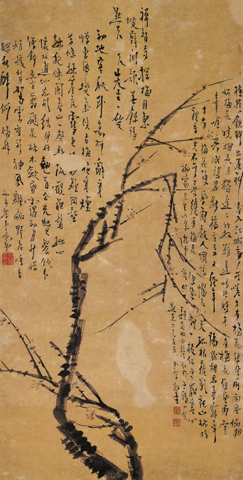 高翔(1688—1752),字凤冈,号西唐,别号山林外臣,扬州人。是石涛的挚友和忠实追随者。他画梅独树一帜:疏枝、半开骨朵,用玉楼人口脂,抹一点红。此画绘老干劲梅一枝,枝干老枯,枝上鲜有梅花,是高翔画梅的典型风格。