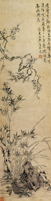 这是画家较早的作品,显得秀气脱俗,生气勃勃,晚年的作品风格有所变化,要粗壮一些。王士慎绘画的题材多样,各种花卉外尚有竹、石等,偏爱清雅,多绘兰、梅等花。这也是当时画家极喜之题。此图绘曲梅、修竹、怪石,画家在自题中称梅为冷香、石兄、竹弟。