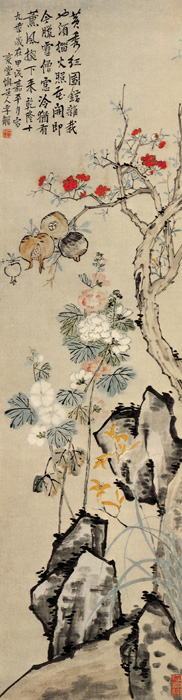 此图画石榴、葵花。画史谓其花鸟学林良,实则出自高其佩门下,远师徐渭。以笔代指,苍劲有力,墨气欲活,稍有霸悍之气。李鱓在绘画上主张“自立门户”, 始终追求独立的人格和个性的表现, 一生画风在不断的探索中经过数次变化。此图写意秋实秋花,作者自题画于乾隆十一年,时年61岁。