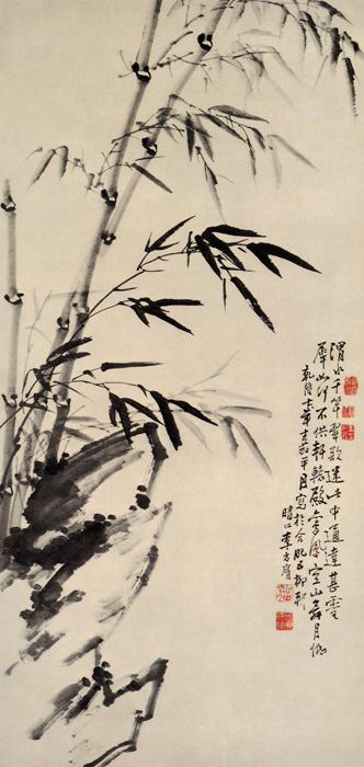 画新篁三竿,枝叶潇洒自如,笔法迅捷挺健,具名款。 李方膺性格耿直,不肯随上官俯仰,被诬罢官,寄居南京,穷老无依,以买画为生。善松菊梅兰,不拘绳墨。画梅铁杆铜皮,刚强不屈,笔意在青藤、竹憨之间,为扬州八家之一。此图萧疏清隽,纵逸不拘于法,深得写生之妙趣。作者时年57岁。