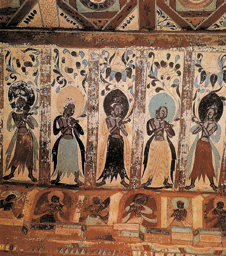 北魏 壁画 敦煌248窟 窟顶人字披东披 纵150厘米 敦煌石窟是敦煌郡内诸石窟的总称, 包括敦煌莫高窟、西千佛洞、安西榆林窟、东千佛洞及肃北蒙古族自治县五个庙石窟等。248窟是西域中心柱与中原殿堂建筑相结合的新形式, 具有敦煌本土特色, 是莫高窟的洞窟。莫高窟属于玉门系砾石, 不适合雕刻, 故大多为泥塑, 现存者包括圆雕、浮雕、影塑, 大小3000余身。壁画内容丰富, 表现佛、菩萨及天神像;佛本生故事、佛传故事;神话题材;经变故事;供养人;佛教史迹故事;装饰图案和建筑图等。《供养菩萨》是248窟中最具艺术价值的壁画, 这些供养菩萨手捧鲜花奉佛, 花叶用笔流畅, 裙子晕染繁密, 画面表现出一种从北魏向西魏过渡的特殊风格。这些壁画大量使用铁线描, 用土红线打轮廓, 石青色晕染明暗面, 再赋色, 最后用墨线提醒, 晕染主要采取西域式凹凸法, 即以明暗关系表现立体感, 富有光影效果。 |