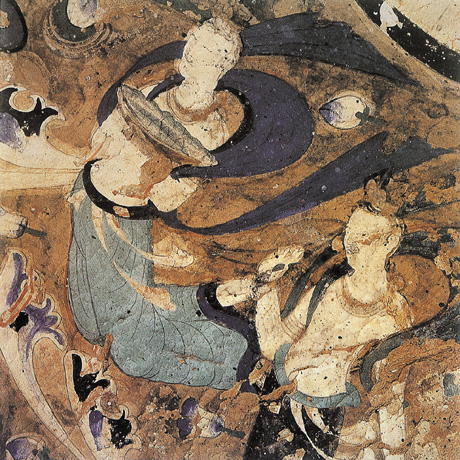 麦积山石窟在甘肃天水县东南45公里处, 秦岭山脉西端, 因其外形望之团团, 如民间积麦之状, 故有此名。此幅《飞天》是麦积山现存最完整的一个飞天藻井, 尽管藻井的前半部已严重的塌毁和剥蚀, 但后半部余下的七身飞天, 色彩艳丽, 线描清晰。从残破处还可以看出, 当时的绘制者先用比较淡的土红色随意勾画出轮廓形象, 待涂一层薄薄的白粉浆后, 再随类赋色作画, 最后则以浓黑的焦墨线勾勒。飞天与浮云的线描非常纤细、挺拔遒劲, 是典型的铁线描法。飞天的颜面、肌肤全用纯白色平涂, 其衣裙飘带,则多用青绿叠染, 仅在个别的地方, 如双唇和花饰处, 略加朱砂点染。 |