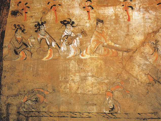 “乐舞百戏”在中国有着悠久的历史,秦汉以前,歌舞与杂技就有较大的发展。画中表现了乐队正演奏音乐,三位乐伎,一弹琵琶、一吹长箫、一击腰鼓,一男乐人正弹奏琴瑟。而下方为杂技表演,二位杂耍艺人正在地毯之上翻腾跳跃。人物形象的塑造分别采用浮雕或线描手法,显出主次前后的关系。画面人物虽密集,因为安排错落有致,却丝毫不显拥塞。