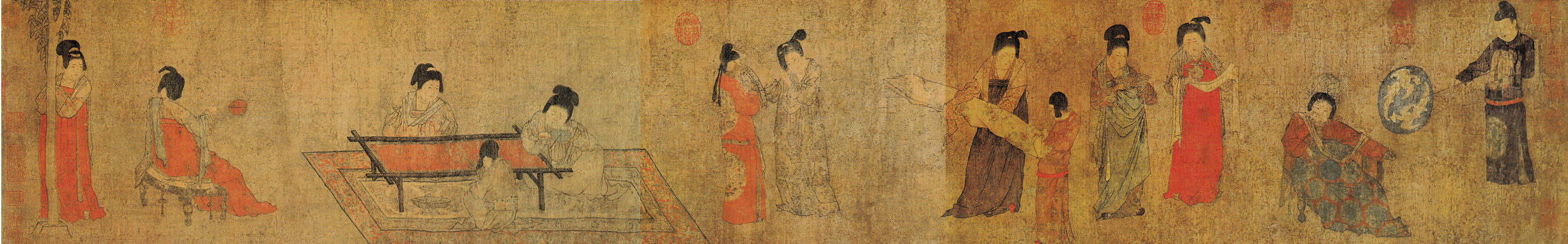 《挥扇仕女图》描绘夏末秋初似乎刚刚睡醒的几位宫妃和侍女在深宫院内纳凉的情景。画卷从右至左展开, 大约可分为四组:手持团扇坐于椅上的妃子睡眼惺松, 神情懒散;其他画中人物衣着华丽, 体态丰满肥硕, 但都流露出惆怅、寂寞、失意、忧郁的精神状态。此画真实地反映了盛唐末期宫廷贵族的奢侈生活和宫中妇女那种难以排遣的忧郁与任人遗弃的社会地位。