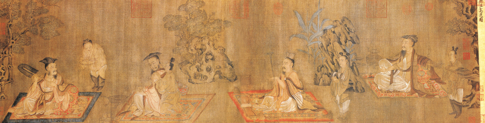 孙位, 又名遇, 号会稽山人, 会稽(今浙江绍兴)人。唐末杰出人物和宗教画家, 曾随唐僖宗入蜀, 在成都等地寺院画过不少佛道教壁画。《高逸图》实际上画的应是以魏晋时期七位著名文人隐士为描写对象的《竹林七贤图》, 不过现在画上只留下山涛、王戎、刘伶、阮籍四人, 另外三人嵇康、向秀、阮咸已遗失了。这四个主体人物分别坐在华丽的花毯上, 每人旁边都有一个小童侍候, 段与段之间有礁石树木相隔, 环境静穆幽雅。从右至左第一人是山涛, 他赤袒上身披衣抱膝而坐, 流露出傲慢神色; 第二人是王戎, 手持长柄如意, 因此人善作“如意舞”; 第三人是刘伶, 表现得爱酒如命; 第四人是阮籍, 手捧麋尾(大鹿之尾), 斜倚花毯而坐。这些“贤人”是尚好清谈、不拘礼法的文人, 作品将不同人物的个性特色和清高、傲慢、放荡不羁的精神状态都刻画得恰如其分。 |