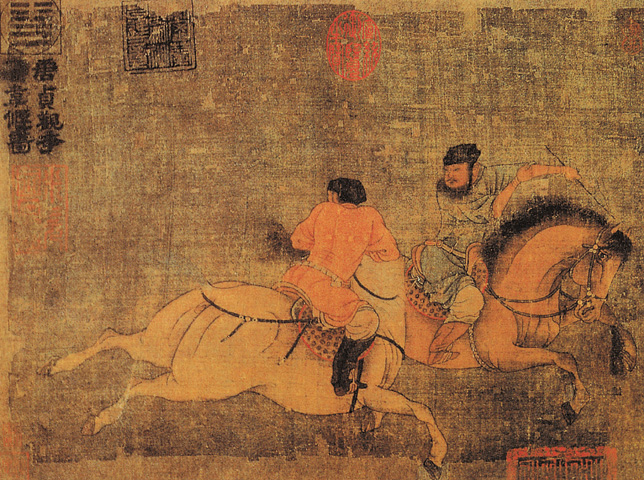 韦偃,生卒年不详,唐代画家。长安(今陕西西安)人。据成都(今属四川)。擅山水、人物。张彦远论其画谓:“点簇鞍马人物,山水烟云,千变万态,山以墨斡,水以手擦,曲尽其妙,宛然如真。”此图表现两位骑手各乘一马,并辔狂纵的情景。画中构图、造型、用笔显示了韦偃的艺术风格。