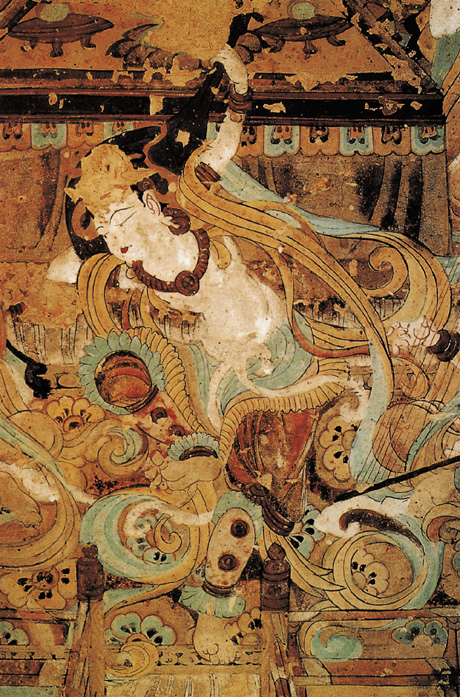 此图见于莫高窟112窟的《伎乐图》,为该窟《西方净土变》的一部分。表现伎乐天神态悠闲雍容、落落大方,手持琵琶,半裸着上身翩翩翻飞,天衣裙裾如游龙惊凤,摇曳生姿,项饰臂钏则在飞动中叮当作响,别饶清韵。突然,她一举足一顿地,一个出胯旋身使出了“反弹琵琶”的绝技——于是,整个天国为之惊羡不已,时间也不再流逝。