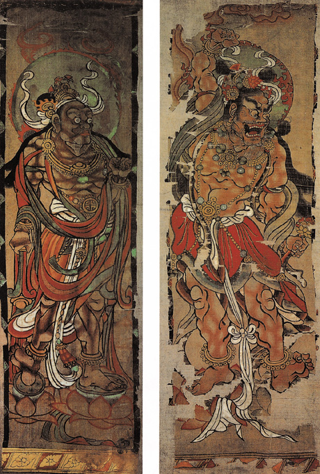 此图发现于敦煌藏经洞。左边力士属于力量内敛型的。然而无处不在的肌肉的体量感又很好地体现了金刚力士的刚毅雄健。右边力士脾气暴躁,性格刚烈,疾恶如仇。那种外在的咄咄逼人和不可阻挡的造势与左边力士的内敛形成一种对比。作者在刻画力士形象时,用笔简练纯熟,酣畅淋漓中的略带方折,对刻画金刚力士的勇武形象更为有利。