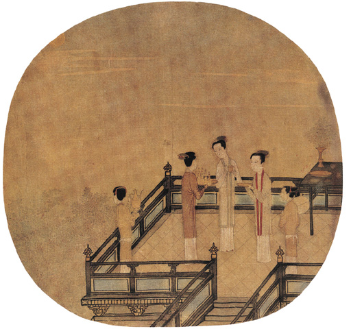 此图原载《四朝选藻册》(见《石渠宝笈续编》)。题刘宗古作。《画继》(卷七)云:“刘宗古,京师人。宣和间(1119—1125),以待诏官至成忠郎。乱离后,归江左。朝廷方寻访车辂式,而宗古进本称旨,除提举车辂院。其画人物,长于成染,不背粉,水墨轻成,但笔墨纤弱耳”。