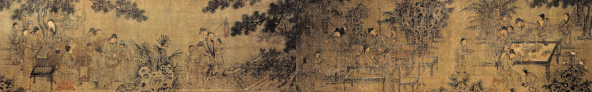 此卷取材于唐代十八学士夜宴的典故。在繁华似锦的庭院中,文人雅士们秉烛夜饮,别有几分洒脱和飘逸。画中的学士们有的不胜酒力,已然激情昂扬;有的酒兴未尽,犹在豪饮,神态尽现风流倜傥。此画用线细匀而流畅,人物形象显得清俊瘿弱,是典型的宋画风格。