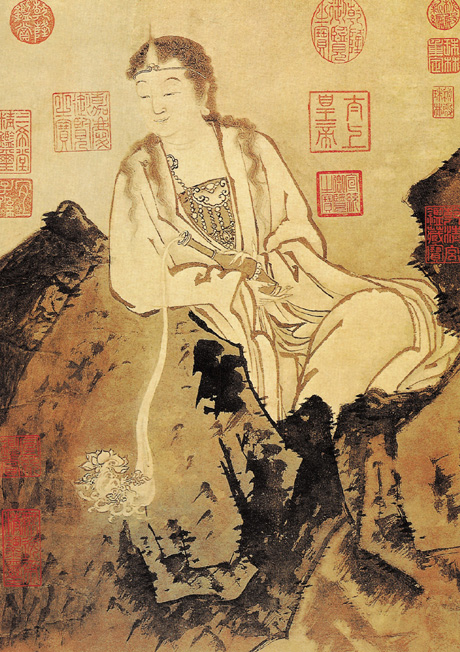 贾师古,生卒年不详,南宋画家。汴(今河南开封)人。擅画道释人物,师法李公麟。高宗绍兴(1131—1162)时为画院祗候。白描人物,颇得闲逸之状。此图中观音大士取斜倚之姿,秀发飘逸,将手中宝瓶倾斜,琼液流溢而成一朵白莲,似乎芳香四溢而令人称奇。