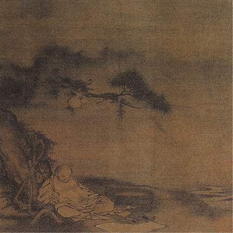全图用笔简练,人物表情含蓄端庄,刻画生动传神。衣纹线条流利,粗重连续,设色富丽堂皇。绘一僧袒腹、结跏趺坐于松根之上,面前杂设纸笔,状似凝思。
