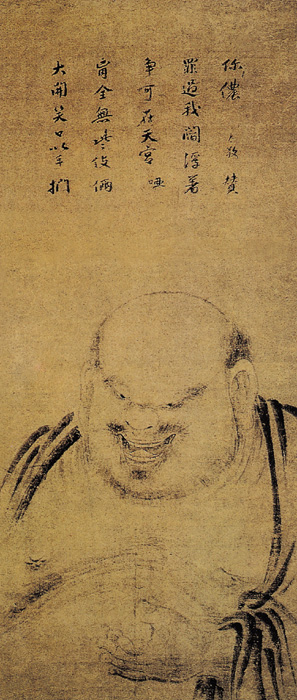 僧法常, 号牧溪, 蜀(今四州)人, 生卒年不详, 其艺术活动主要约在13世纪60-80年代之际。曾因抨击奸相贾似道而遭通缉, 逃至浙江一丘姓人家中避难。法常善画龙、虎、猿、鹤、芦雁、山水、人物。布袋和尚为五代后梁时僧人,世传为弥勒菩萨化身。此图中的布袋和尚为半身像,双手捧腹,作开口大笑状。