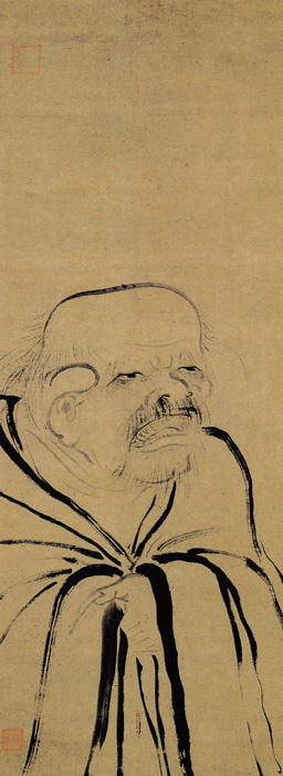 法常的用笔由梁楷的“简笔”变化而来,但较之稍为“文气”一些,收敛一些。图中的老子,因鼻毛外露,被称人“鼻毛老子”。此幅中,老子招风耳、秃头、张巨口,鼻毛直挂唇边,形貌奇特,有道是“奇人自有奇相”,真正仙风道骨,奇绝脱俗,状神写貌,尽得人物风流和神韵。