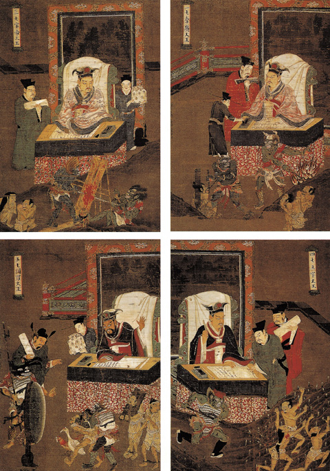 此《地藏十王图》共十一幅,即十殿阎罗各一幅,地藏菩萨一幅。应是以地藏图为中心,左右对称布置。此画大肆宣扬恶人在阴间所受的惩罚,带有很强的戒恶扬善性质。这里所选的是“秦广王蒋”、“宋帝王余”、“五官王吕”、“阎罗天子包”四殿阎罗像。在表现人物时,画家笔法工细,设色妍丽,有装饰效果。