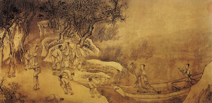 何澄(1223—?),燕(今河北省)人。元世祖时被召待诏内庭。后因献界图而被超擢为昭文馆大学士,中奉大夫,是一官职品级很高的宫廷画家。善画人物、故实、界画、鞍马等。山水人物画有南宋院体遗规,鞍马师法北宋李公麟。《归庄图》取材晋·陶渊明《归去来兮》辞,此画以山水为背景,人物穿插其间,在全景式构图中,主题人物连续出现,逐段反映陶渊明辞官归故里的主要情节,与传称为晋·顾恺之《洛神赋图》同一手法。人物线描多用方折笔,山石树木用枯笔焦墨,间以淡墨晕染,劲健中含秀润,苍率中蕴清逸。画风虽有南宋院体遗规,亦开元代逸笔先路。 |