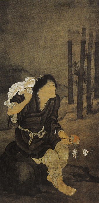 颜辉,字秋月,浙江江山人,一作庐陵人。擅长画道释人物,也善画猿。所作形象,造型奇特,神态生动,时人称之为“八面生意”。画法上粗笔居多,笔墨劲健豪放,渊源于南宋梁楷的泼墨减笔法。蛤蟆仙人是道教传说中的神仙,其形象与元、明两代流行的道教神仙刘海蟾接近,二者可能为一个。此图与前幅《铁拐仙人像》组成对幅,风格一致。