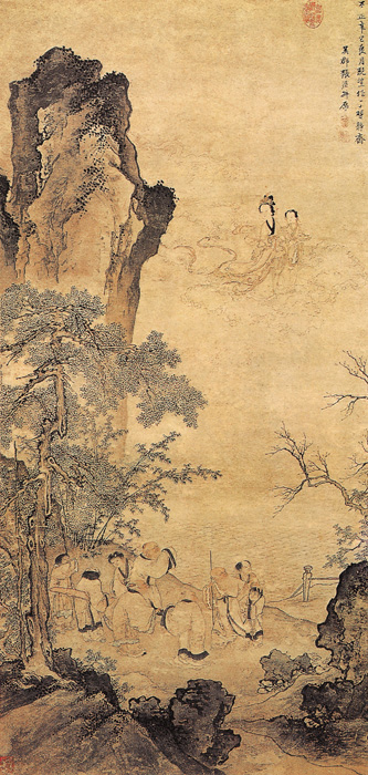 此图取祝寿吉祥之意。画中瑶池烟波浩渺,岸边高崖耸立,树木葱笼。四位寿星须发皆白,却面色红润,精神矍铄,正仰望空中,欣喜地恭迎西王母。空中祥云缭绕,西王母衣袂飘飘,正按落云头而来。身旁侍女手捧托盘,上有仙桃四枚,画面构图上下呼应,以白描手法为主,淡加敷色。山水之景与人物之情融合在一起,自成天趣。