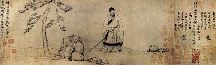 倪瓒(1301—1374), “元四家”之一, 字元镇, 号云林, 别号幻霞生、荆蛮民、奚元朗、净名居士、朱阳馆主等。王绎(1333—?), 字思善, 号痴绝生, 后寓居杭州。王绎自幼笃志好学, 富有才华。 后经名家顾逵指点, 画艺益进, 成为当时著名的肖像画家。《杨竹西小像》画杨谦, 号竹西居士的小像。杨竹西, 松江人。画中高士杨竹西曳杖缓行, 人物神态闲适。人物面部轮廓须眉全用细笔精心勾勒, 略作淡墨晕染, 神气活现纸上, 自然、生动。衣纹线条则简括洗练。倪瓒补松树坡石。倪瓒记后云:“杨竹西高士小像, 严陵王绎写, 句吴倪瓒补松石。癸卯二月。” |