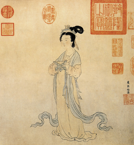 周朗,字朗伯,号冰壶画隐,元顺帝时人。此图所绘女子为唐代杜秋娘,善歌唱,长吹箫,初为镇海节度使李錡妾、后李錡返唐被诛,杜秋没籍入宫。画中杜秋娘手持排箫婷立,作唐妆打扮,梳高髻,着长裙,两眸凝神,表情平淡。此当是她入宫侍奉皇子时的像,以吹箫排遣郁闷的心境。人物面相丰润,身材适中,具“唐妆”仕女特征,又带清丽之姿,形象刻画简练传神。画法工笔淡设色。衣纹用笔飘洒,兼取唐代张萱、周昉的琴弦描和吴道子的兰叶描,匀劲而又流畅,颇与表现唐代女子的题材相和谐。而设色淡雅,不同于唐人的重彩法,也更恰当地突出了杜秋娘的淡泊人生。 |