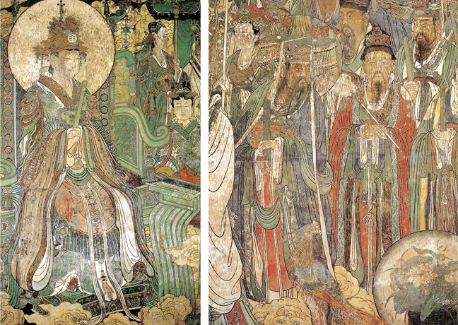马君详、马七等人,皆元代画工,河南府洛京(今洛阳)人,生平不详。《朝元图》为永乐宫壁画的一部分,是元代壁画艺术的最高曲范。永乐宫原在山西永济县永乐镇,相传为道教祖师之一吕洞宾的故宅。壁画以八个高3米的主像(南极、北极、东极、玉皇、勾陈、木公、后土、金母)为中心,前画青龙、白虎二星君,后有天蓬、天犹二元帅,周置仙曹、仙官、天丁、力士、太乙、侍臣、金童、玉女、二十八宿、三十二帝君等、共画像394身。