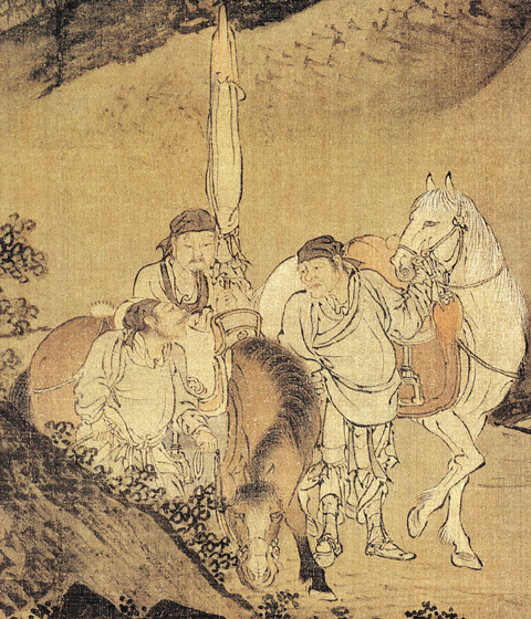 明 倪端 绢本淡设色 纵163.8厘米 横92.7厘米 北京故宫博物院藏 倪端,字仲正,杭州人。生卒年不详。宣德中入画院。工书善画,长于道释人物,兼工花卉,山水宗马远一派。《聘庞图》描绘的是三国时期“礼贤下士”的历史题材,在画面上展现荆州刺史刘表亲至山林聘请隐士庞德公的故事情节。庞德公是名士庞统的叔父,与徐庶、诸葛亮、司马德操等贤达交谊笃厚。刘表数次聘请庞公,未获应允,只得叹息而去。 画面上着重刻划了刘表诚挚谦恭的态度,从而突出了统治者招聘访贤的主题。作品与其说是赞颂历史人物,不如说是在表彰当朝君王的德政,这是明代宫廷画的共同特点。 |