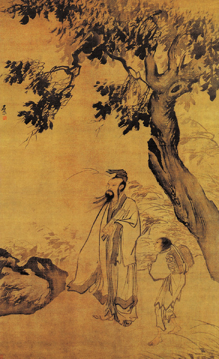 万邦治,生平画史无记载。据传世作品考,字石泉,擅画人物,其笔墨明显受到浙派影响。 此图描绘一老者伫立在古树下寻觅佳句的情景。老人鹤发童颜,清逸矍铄,似乎仙风道骨一种扑面而来。画面风格豪爽飘洒,有“江夏派”吴伟之笔意。