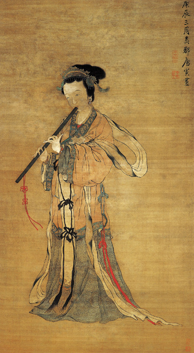 唐寅的人物画,大致未逾南宋人物画的格局,多在刻意塑造一种娇小而端丽的美女形象。这幅《吹箫图》仍然沿袭了他早年人物画工细艳丽的特点,人物面容娟秀,体态端庄。衣纹用笔粗简,劲力流畅,顿挫宛转。