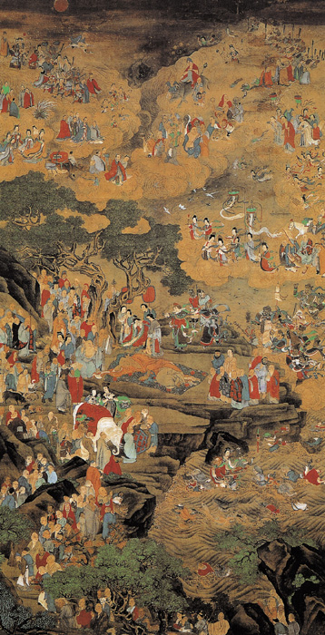 此图表现佛祖圆寂涅磐的场景。佛祖衣纹用线粗重,穿插自然有势,粗重的衣纹之间饰以数种细纹,衣服的整体描写尚属工细。弟子及其他人物,则用粗线处理。弟子的面部表情虔诚,表达出作者对佛的虔诚和敬意。整幅作品用笔拙厚而不板滞,有一定的装饰趣味。 众多佛门弟子、道家神仙、精怪鬼异及凡界男女,纷纷前来吊唁。神情或悲恸,或穆然,或惊诧,与佛祖平和安详的神态形成鲜明对比。