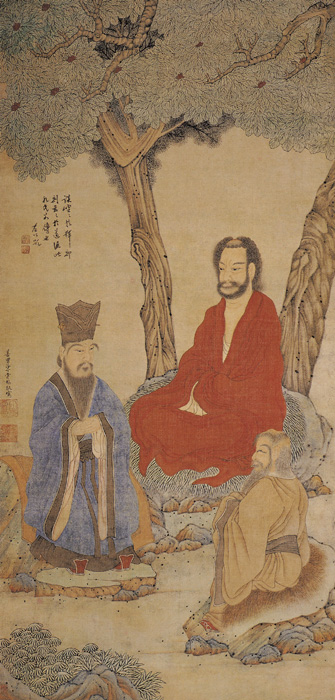 明 丁云鹏 纸本设色 纵115.7厘米 横55.8厘米 北京故宫博物院藏 图中描绘佛、儒、道三教创始者共坐树下相谈的场景。事实上这种场面是从来不曾存在的,画家不过是凭借手中画笔,表达了自己对佛、道思想的膜拜以及对儒家学说的尊崇。在画中,丁云鹏一方面是由于自己的对佛像的擅长,一方面更是以信徒的身份,因此,他将释迦牟尼置于中心,端坐于绿柏与菩提树下,课晶、凸鼻、虬须、红袍,法相庄严慈祥。释迦两侧的岩石上,分画孔子与老子侧坐。孔子束峨冠蓄长须,着蓝色暗花长袍。老子骨骼权奇,长眉疏发,着褐色布袍、云头红履。 |