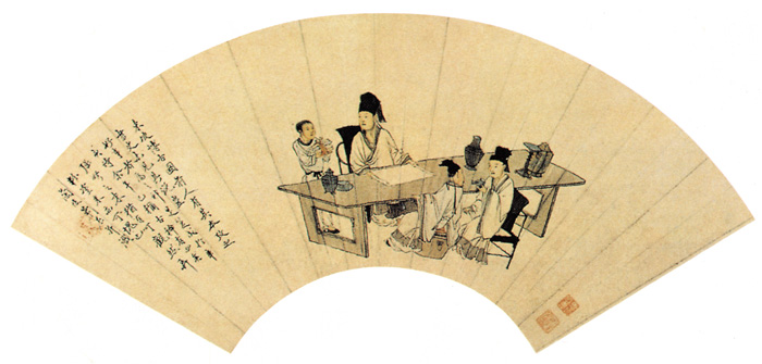 萧晨的仕女画介乎继承传统和创新之间,既重视绵长秀润的线条的表现力,同时还在绘画中加进光影等因素。《东坡博古图》中人物神态逼肖,画家用游刃有余的方折线条来表达人物的外在形象,而且进一步体现人物的精神状态。