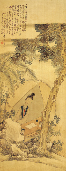 顾洛(1763—约1837),字西梅,号禹门,浙江钱塘(今杭州)人。擅书画。画工人物、山水、人物古雅,山水苍润;花卉、翎毛亦见生动。仕女工致妍丽,尤为著名。生平作画未尝重稿,亦未授一弟子。此画以淡墨写意绘庭院中的树木竹石,点撇随意,韵味清冷。小青,据传为明万历间女子,杭州豪公子冯某妾。能诗善音律。为大妇不容,被置孤山别业,抑郁而死。画中冯小青,清秀瘦弱,顾影自怜,孤坐于案几旁,面带愁思,郁郁寡欢,颇现人物之神韵。