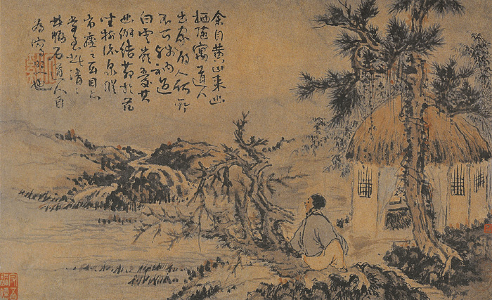 髡残(1612—约1692),俗姓刘,字介丘,号白秃、石道人、残道者、电住道人等,湖南武陵(今常德)人,久居南京牛首山幽楼寺为僧。擅画山水,受“元季四大家”影响,尤其于王蒙笔法得力最多。兼学明季沈周季文徵明,画有文人气息。喜作渴笔或秃笔秋景山水,皴擦层次丰富浑厚,笔墨荒率苍雄,“粗头乱服”,自成一格,与石涛等人称“清初四画僧”。此画代表了髡残人物画的典型风貌。