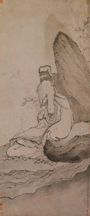 石涛(1642—1715),清代画家。俗姓朱,名若极,小字阿长。广西全州人。明藩靖江王朱守谦的后裔。明朝灭亡后家遭不幸失去亲人,5岁削发为僧,得以存生。法名原济,一作元济,字石涛,号大涤子、清湘老人、瞎尊者、零丁老人等。又自称苦瓜和尚。他曾拜旅庵本月为师,传学佛学,云游四方。元济善画山水,兼工兰竹。画中人物形象以很简古的墨线勾写,几乎全为线描,而设以淡雅之色,衣纹等看似信笔率意而成,实乃深具功力,笔笔送到。