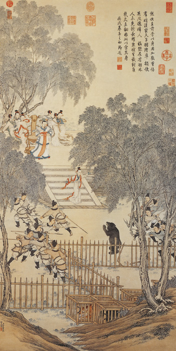 金廷标,生卒年不详,乌程人。画家金鸿之子,乾隆中供奉内廷,善画山水、人物、佛像,尤工白描,画风工细。此画取材于汉刘向《列女传》,表现冯婕妤挡熊的历史故事。冯婕妤是汉元帝的妃子,一次随帝观看斗兽,熊从兽圈跳出,左右侍从皆惊走,冯婕妤临危不惧,以身挡熊。