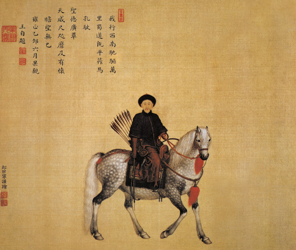郎世宁擅长人物、肖像、花卉、鸟兽以及历史题材的绘画,以中西画法并用而独具一格。清代的《欧钵罗室书画过目考》中记载:“郎世宁,供奉内廷祗候,画马兼工人物屋宇,多从西法。张抑山处士藏有小墨马尺幅,装于镜屏,为奉敕画,闻归延树南尚书;又见有五猫相戏大帧,落花满地,嫩草围石,神趣宛真,所写之貌盖西种也,亦奉敕画。”《允礼像》用中西掺合的笔法,使肖像神气生动。允礼,即果亲王,康熙第十七子,雍正初封多罗果郡王,晋封亲王。 |