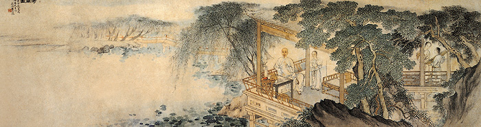 《倚栏图》是一幅有代表性的作品。主人坐在水榭的亭台里,旁设一桌子,摆着花瓶,插着鲜花。主人自在地扶栏而坐,右有侍者侧立。画的右边,有一抱琴者与对面的仕女们在谈论什么。这种将肖像画与古典人物结合在自然环境里,而且能取得和谐,这是费丹旭肖像突破前人所取得的成就。神无可绘,真境逼而神境生,无画处皆成妙境。此画为费丹旭中年时的作品,园林背景笔力苍劲不足,画面也不够浑厚,但在人物与环境的布局上尚能协调。