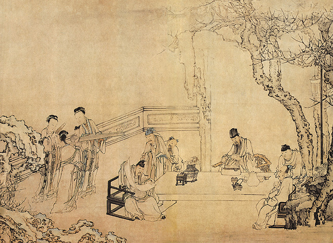 画中的人物衣纹作游丝描、铁线描,或连勾带染,挺劲放纵;以草书之笔入画,极具功力。作者虽师法陈老莲、上官周,然又自创新意。此图取材于李白的《春夜宴桃李园》诗意。人物情态各异,动静有别,生动传神。