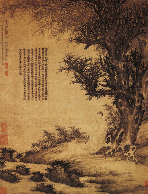 清 吴宏 樊圻 纸本设色 纵79.5厘米 横60.6厘米 南京博物馆藏 吴宏,生卒年代不详。清代画家。一作弘,字远度,号竹史。江西金溪人,长居江宁(今南京)。他自幼喜好书画,诗书皆精,金陵八家之一。樊圻(1616—1694),清代画家。字会公、洽公。金陵(今江苏南京)人。他与其兄樊沂均以画出名。为明末清初的金陵八家之一。此图由樊圻画肖像,吴宏补景。这是一幅带有风景的肖像画。画中人名为寇湄,是明末清初金陵秦淮名妓,善于弹奏古琴,能作曲,并工画兰竹。这幅作品中,由樊圻所画的寇湄肖像,浓妆安坐,娟娟秀美,穆然恬静。吴宏的补景和肖像画相和谐。 |
