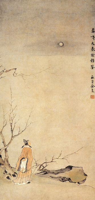 余集(1738—1823),字蓉裳,号秋室,钱塘(今浙江杭州)人。乾隆三十一年(1766)进士,官至侍讲学士。擅画山水、花卉、禽鸟、兰竹,尤工仕女,无不精妙,工书及诗画,时称三绝。此图中画一士人在梅下赏月的情景。两枝老梅偃蹇相伴,环境幽雅而富有诗意。