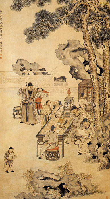 汪圻生卒年不详,擅长人物。五老就是指宋代苏东坡等五学士,此画即是表现五学士在一起谈论诗文的场景。人物用笔工细严谨,背景的山和松,则用没骨法,显得工放结合,松秀而灵动。